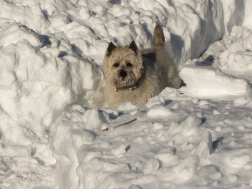 With snow this deep he can go right out the patio door without hooking up the dog run, it’s nice, for both of us. You can see his tail from the house, just above the lip of the trench, it’s funny. Bailey is 11 .