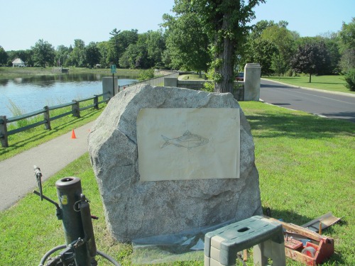 Well, today we get to see the finished product of Mark Damsell’s efforts . The stone cutter is just about ready to begin sandblasting the face of the 6 ton boulder with a Welcome message. It might be all done by the Farmers Market today, so stroll on down.