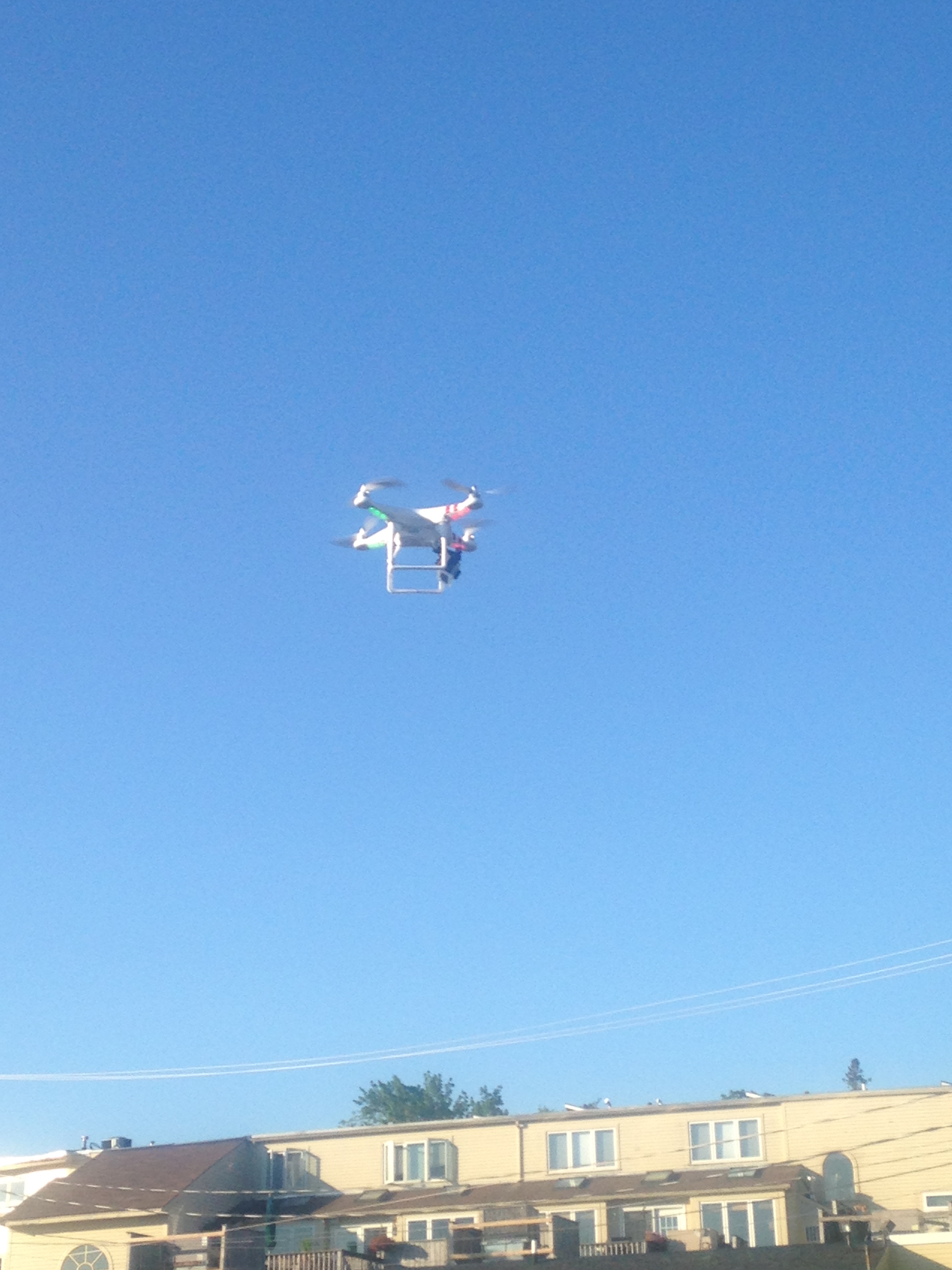 This gent was employing a fixed GoPro camera set to take a pic on 5 sec intervals. The drone has a flight time of 10 -15 minutes and blinks a red light when the battery is running low. If it loses contact with the controller it defaults to a home program and returns to it’s launch point. You don’t have to land it, just bring it in close and grab the handle.